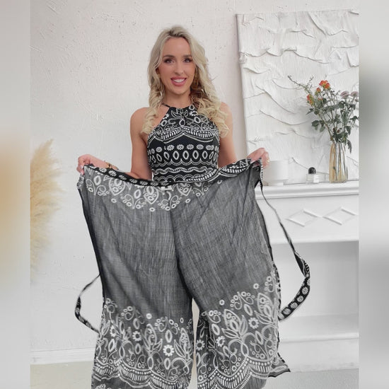 Boho Tribal Print & Vacation Vibes – Featuring a striking symmetrical tribal print, this two-piece set exudes a vibrant vacation-ready feel. Pair with strappy sandals, a wide-brim hat, and woven tote for effortless beach styling, or add espadrilles and statement earrings for summer parties and tropical escapes.