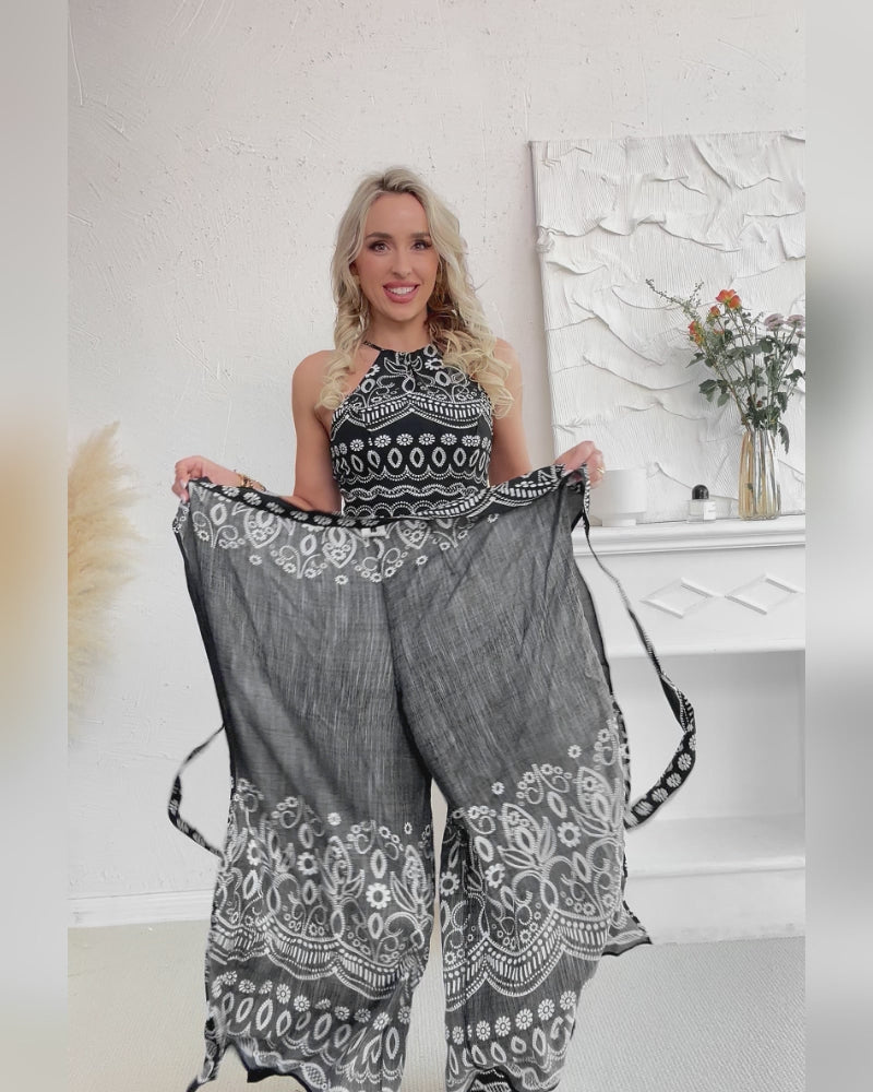 2 Pieces Outfits Tribal Print Keyhole Neck Sleeveless Top and Wide Leg Tied Detail Slit Pants Sets