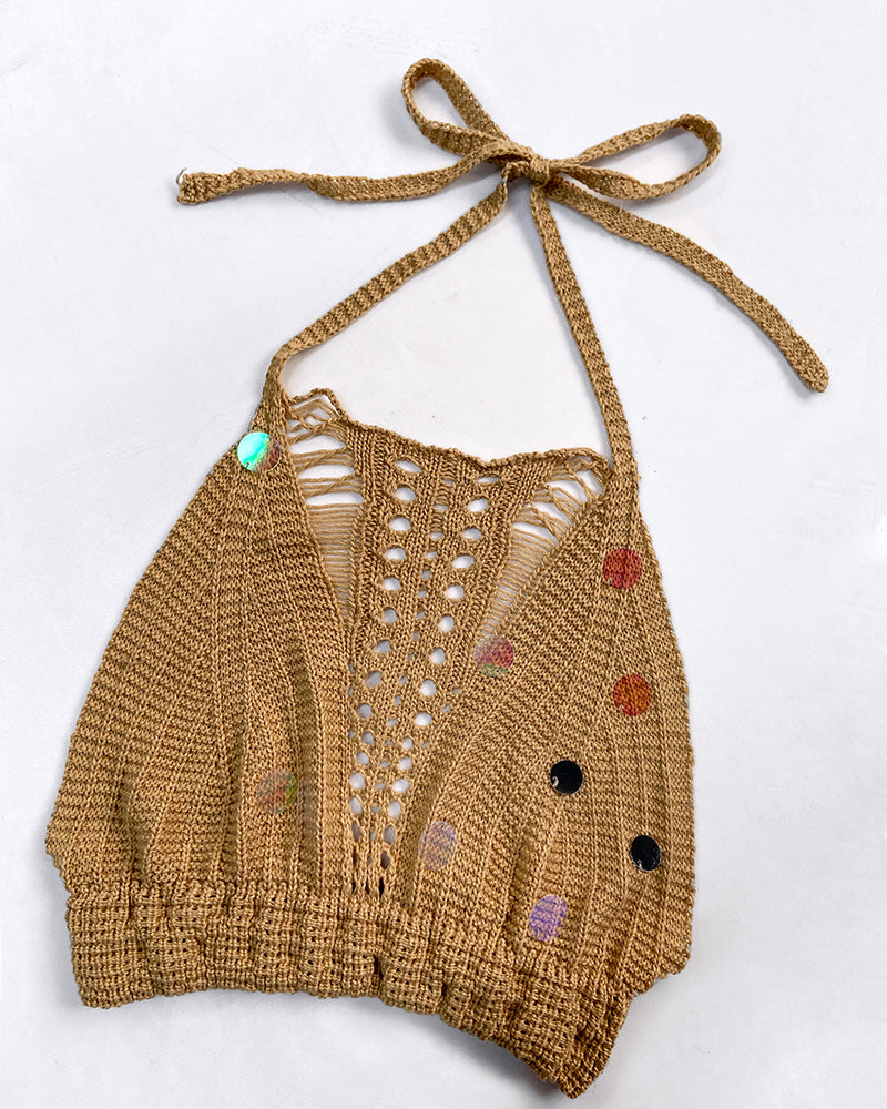 2 Pieces Round Sequin Knitted Halter Sleeveless Crop Top and Casual Strechy Waist Wide Leg Knit Pants Set