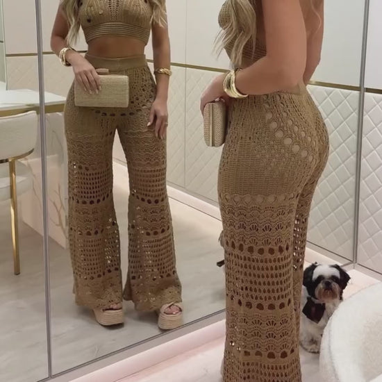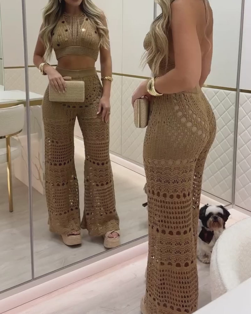 Unique Hollow-out Detailing – The top is adorned with metallic sequins that catch the eyes; The long pants have a high waist with an elastic band for a snug fit. The hollow-out accents on the pants add a trendy touch to the design, making this outfit perfect for vacation.