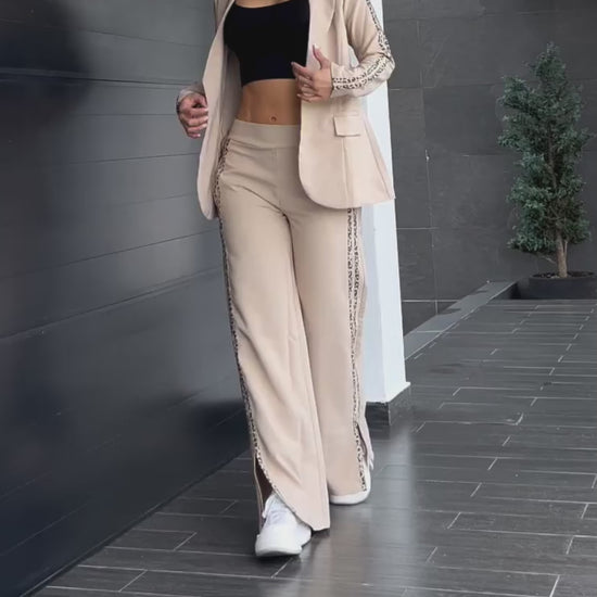 2PCS Leopard Tape Patch Notched Collar Blazer & Contrast Binding Slit Pants Set
