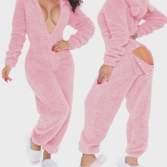 3D Ear Buttoned Flap Functional Fluffy Lounge Jumpsuit