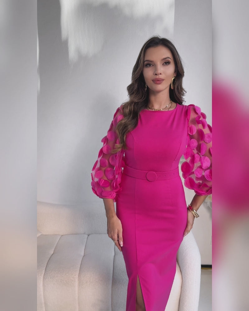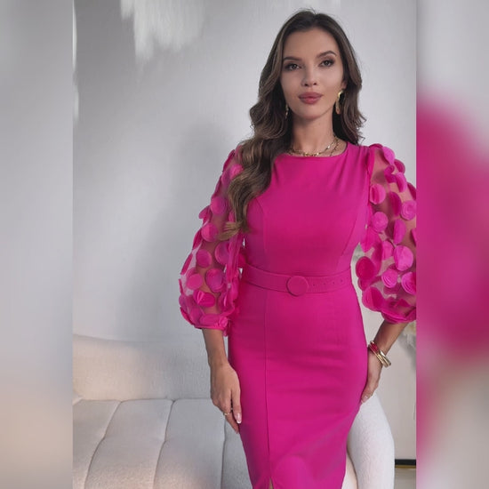 3D Polka Dot Appliques Mesh Lantern Sleeve Zipper Back Slit Work Dress Cinched Waist Slim Fit Mid Length Dress With Belt