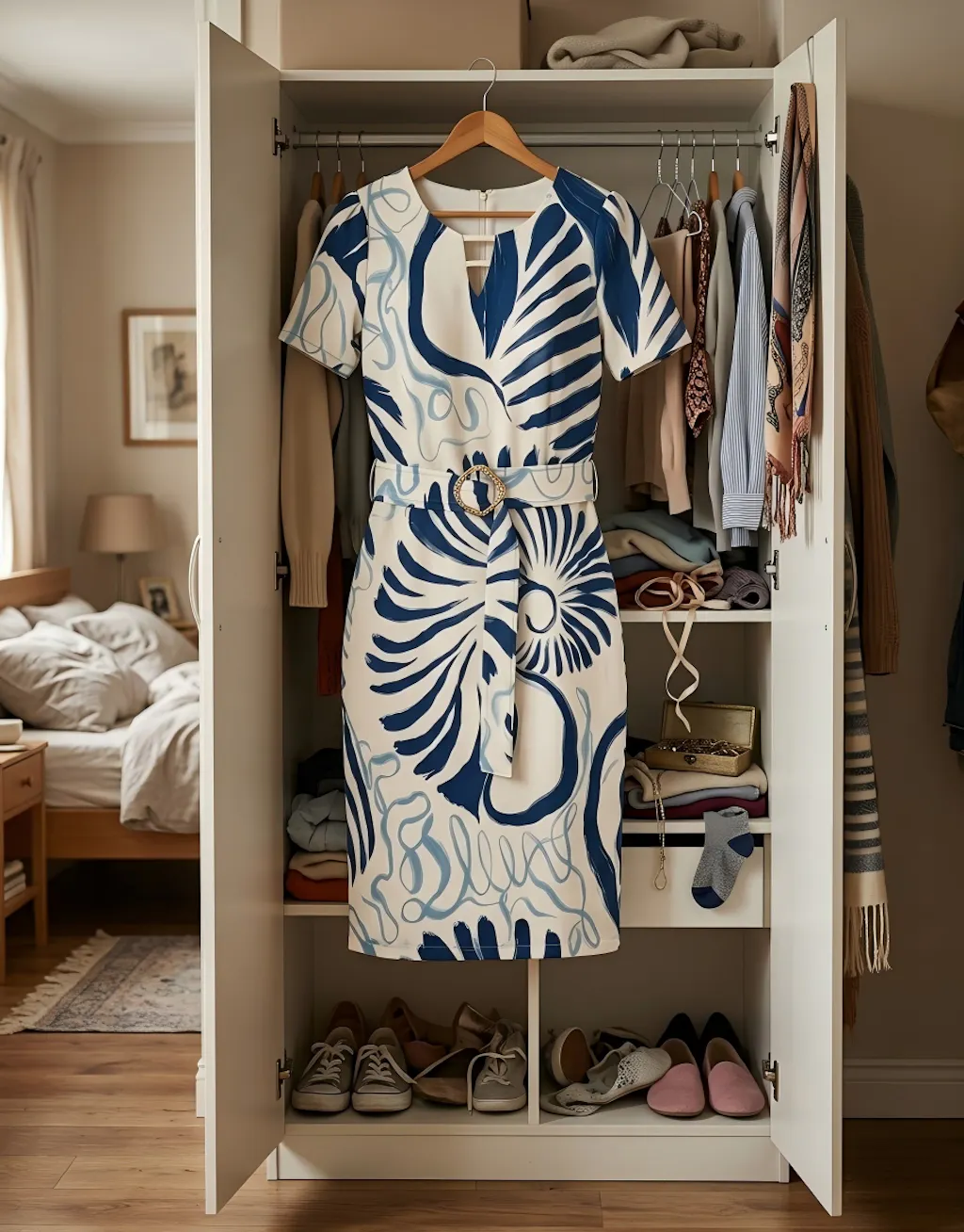 Must-have midi dress! Beautiful abstract design, nice hollow-out detail, comes with a great belt. The fit is amazing and the fabric feels high quality.