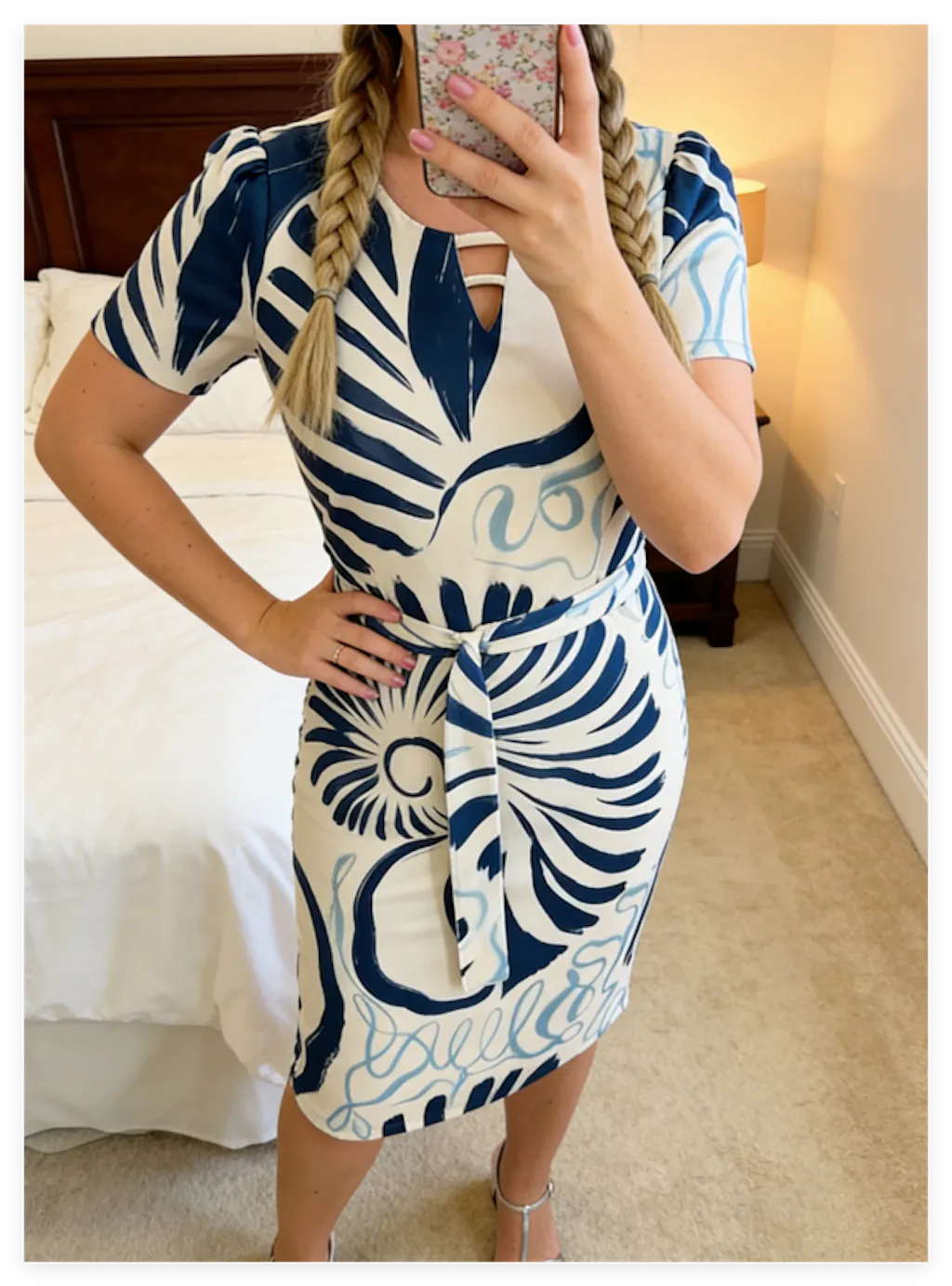Gorgeous midi dress! Eye-catching abstract print, cute hollow-out design, soft material, and the belt adds a nice touch. Fits true to size and is super flattering.