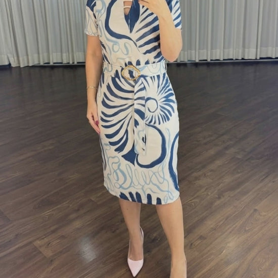 Abstract Print Short Sleeve Hollow-out Front Midi Dress with Belt