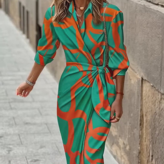 Abstract Print Turn-down Collar Tied Detail Ruched Dress Casual Wrap Front Vacation Dress
