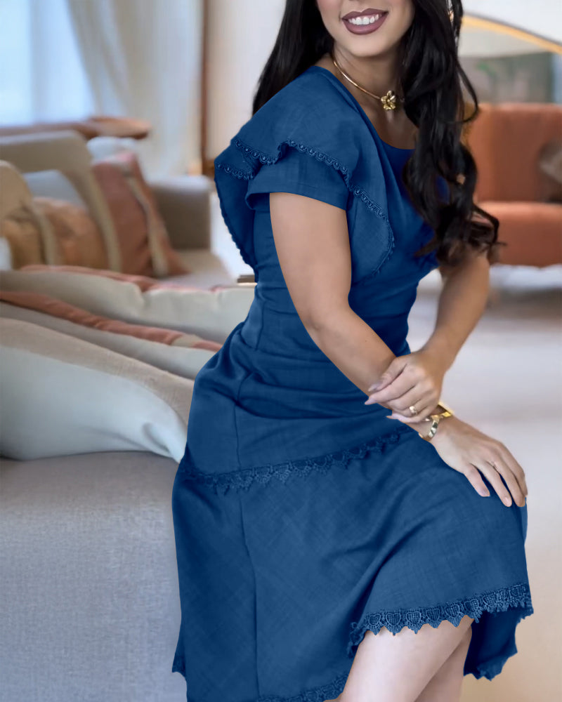 Butterfly Sleeve Hollow-out Back Shirred Work Dress Casual Cinched Waist Lace Trim Ruffle Hem Dress