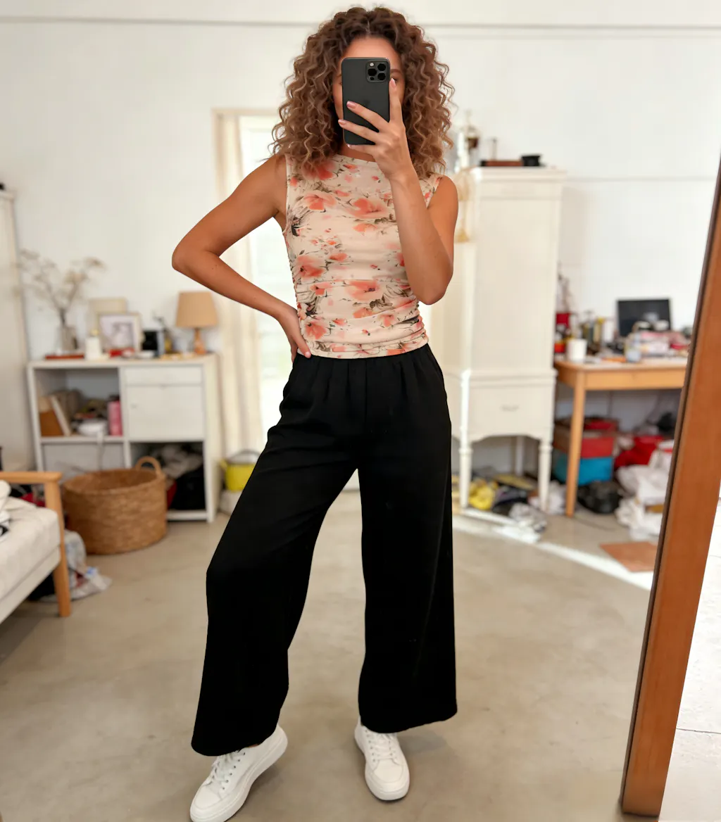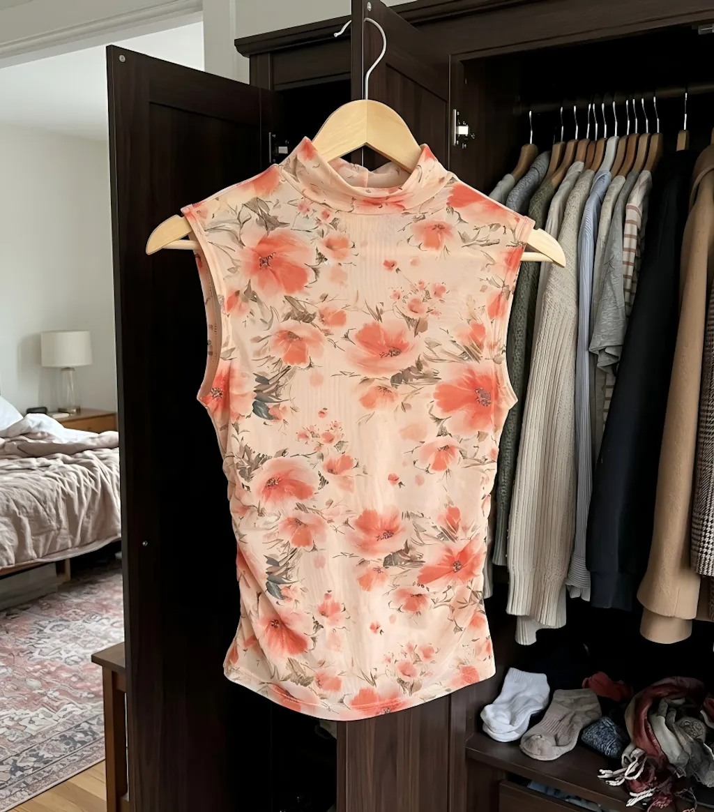CHICME Women's Floral Print Mesh Top Sleeveless Cowl Neck Ruched Side Blouse Sheer Sexy Slim Fit Tank Top