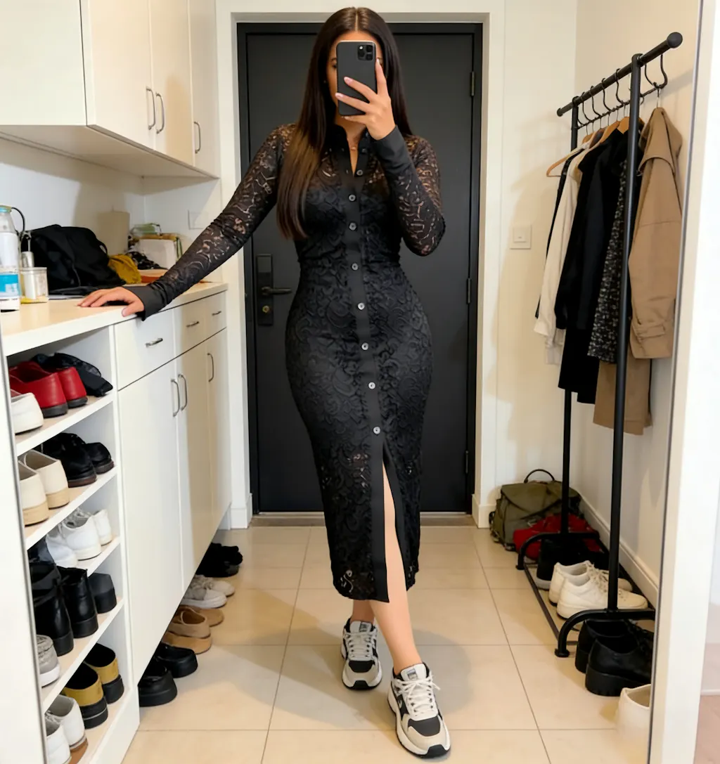 DESIGN - Stand Collar & Button Details: Designed with a sophisticated stand collar to frame the neckline and a full-length button-down front that allows for adjustable styling. The sheer long sleeves create a graceful contrast with the lace texture, while the lower slit below the buttons increases mobility and adds a dynamic visual element.