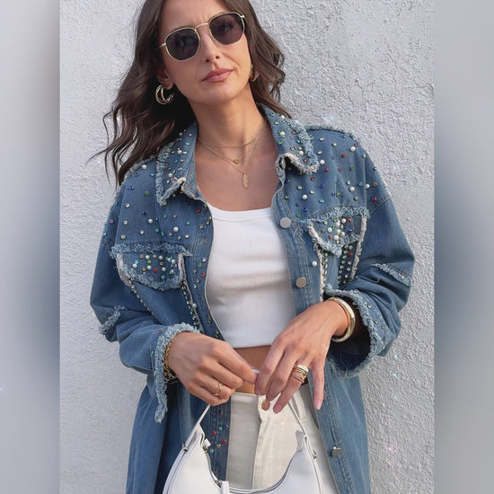 Feature Details – Oversized cut with turn-down collar, button-down front, long cuffed sleeves, flap pockets, and high-low raw hem. This denim jacket is adorned with colorful rhinestones and pearls, and features frayed edge detailing for added texture and style.