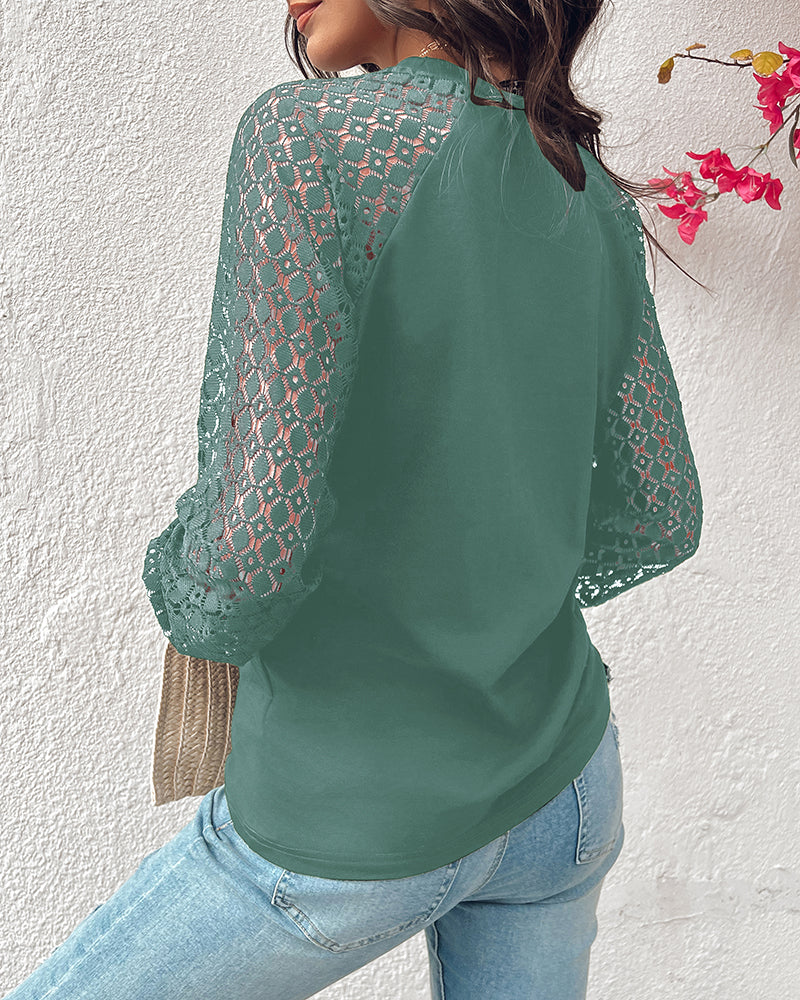 Contrast Lace Round Neck Lantern Sleeve Ruched Blouse Elegant Shirt