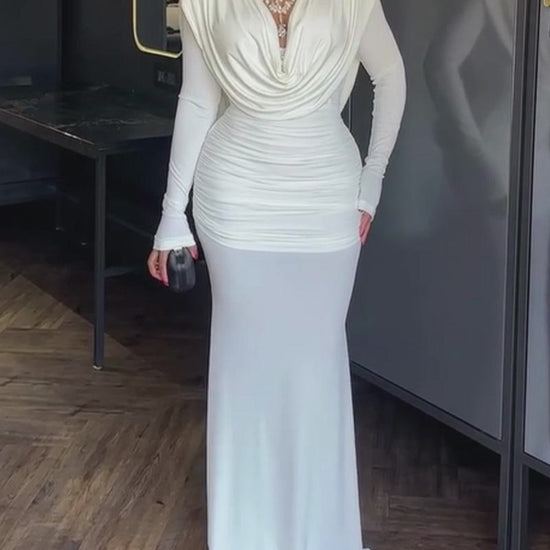 Cowl Neck Ruched Zipper Back Slim Fit Maxi Dress Casual Padded Shoulders Backless Evening Dress