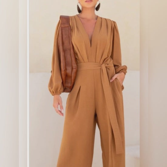 Deep V Neck 3D Design Tie Waist Ruched Overalls Casual Cinched Waist Zipper Back Textured Jumpsuit with Belt