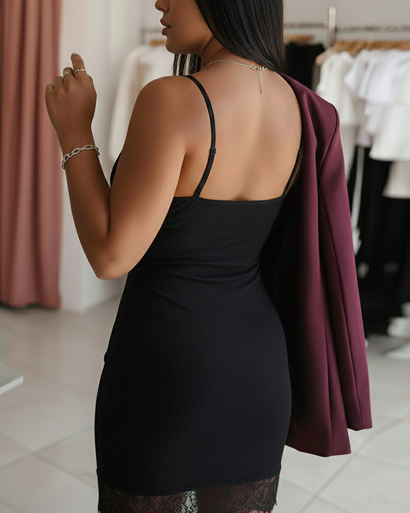 Deep V-Neck Adjustable Spaghetti Straps Lace Spliced Mini Dress Slim Fit Ribbed Cami Dress