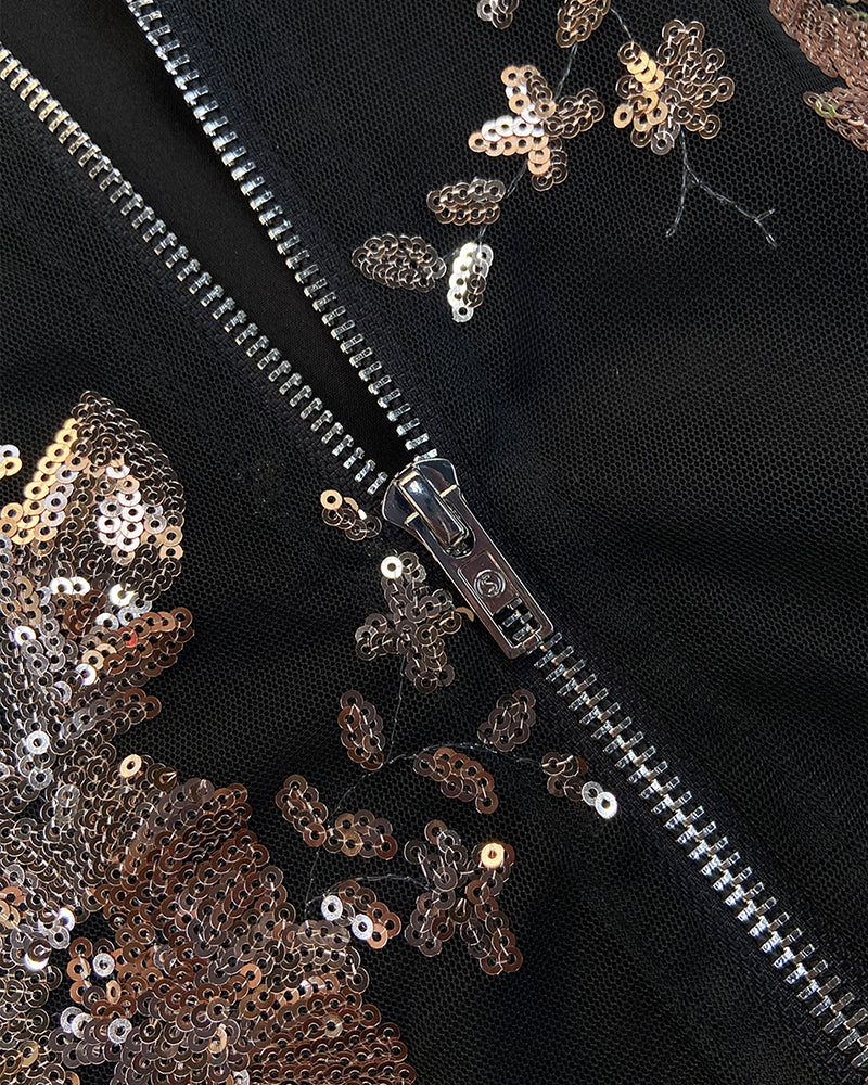 - Dazzling Floral Sequin Design: The jacket's surface is adorned with intricate floral-patterned sequins, creating a glamorous and eye-catching look that reflects light beautifully, perfect for elevating your style.