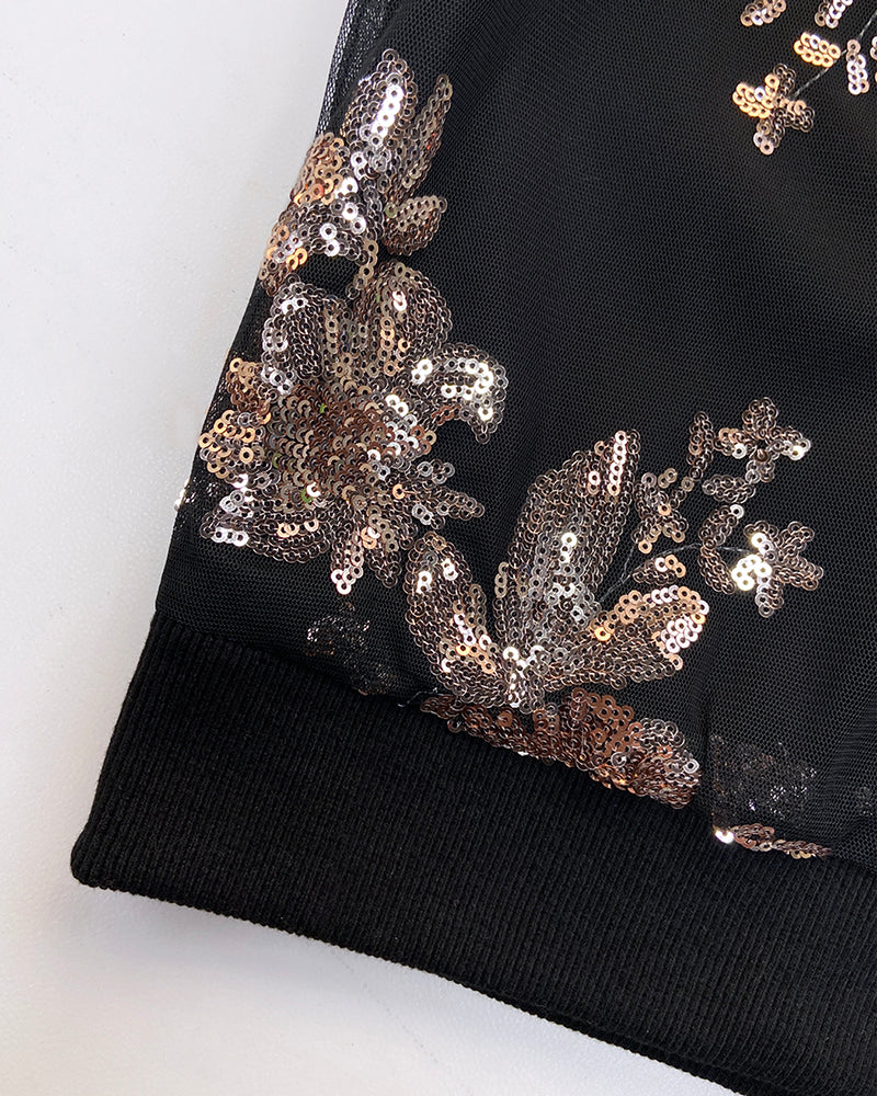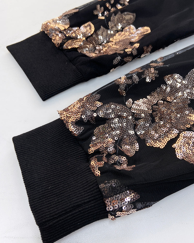 Floral Pattern Baseball Collar Long Sleeve Coat Contrast Sequin Zip Up Jacket