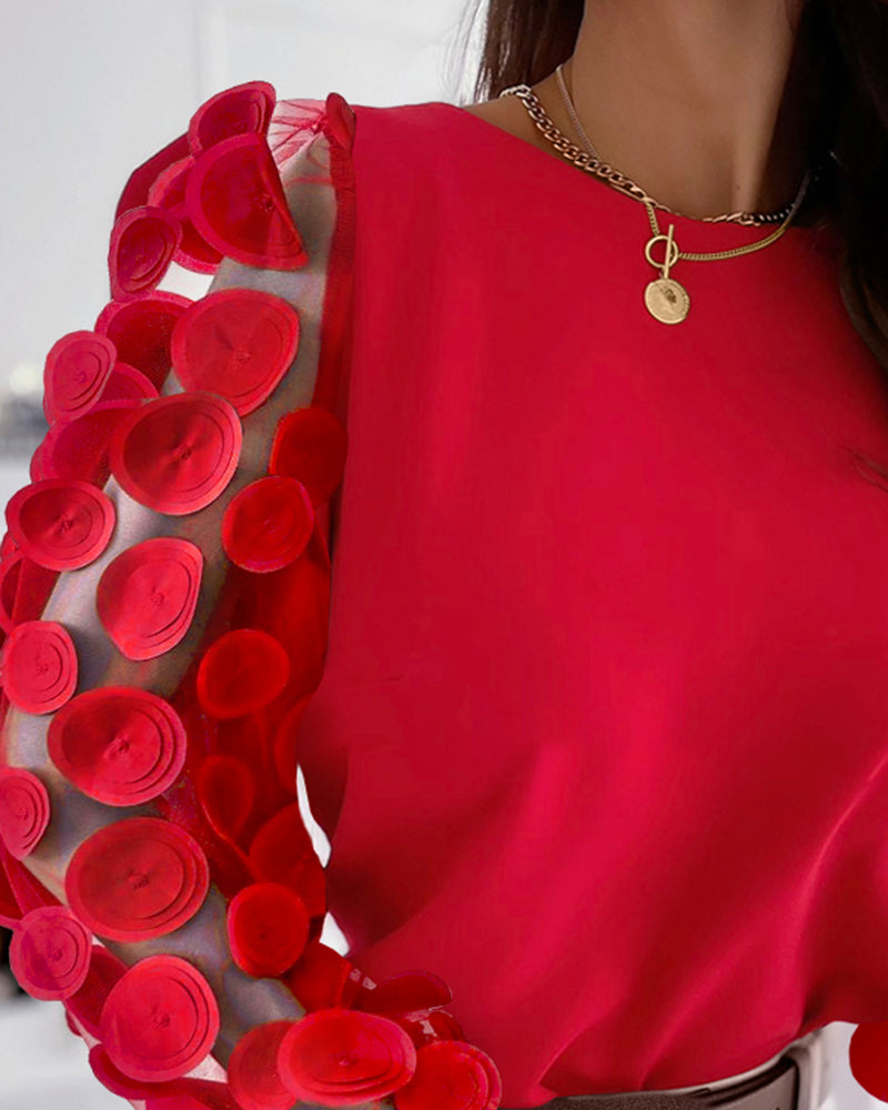 Floral Pattern Long Sleeve See Through Sheer Mesh Tops Pullover Tee Shirt