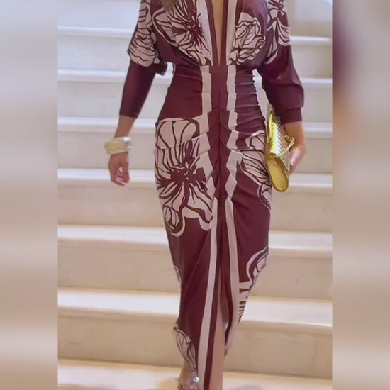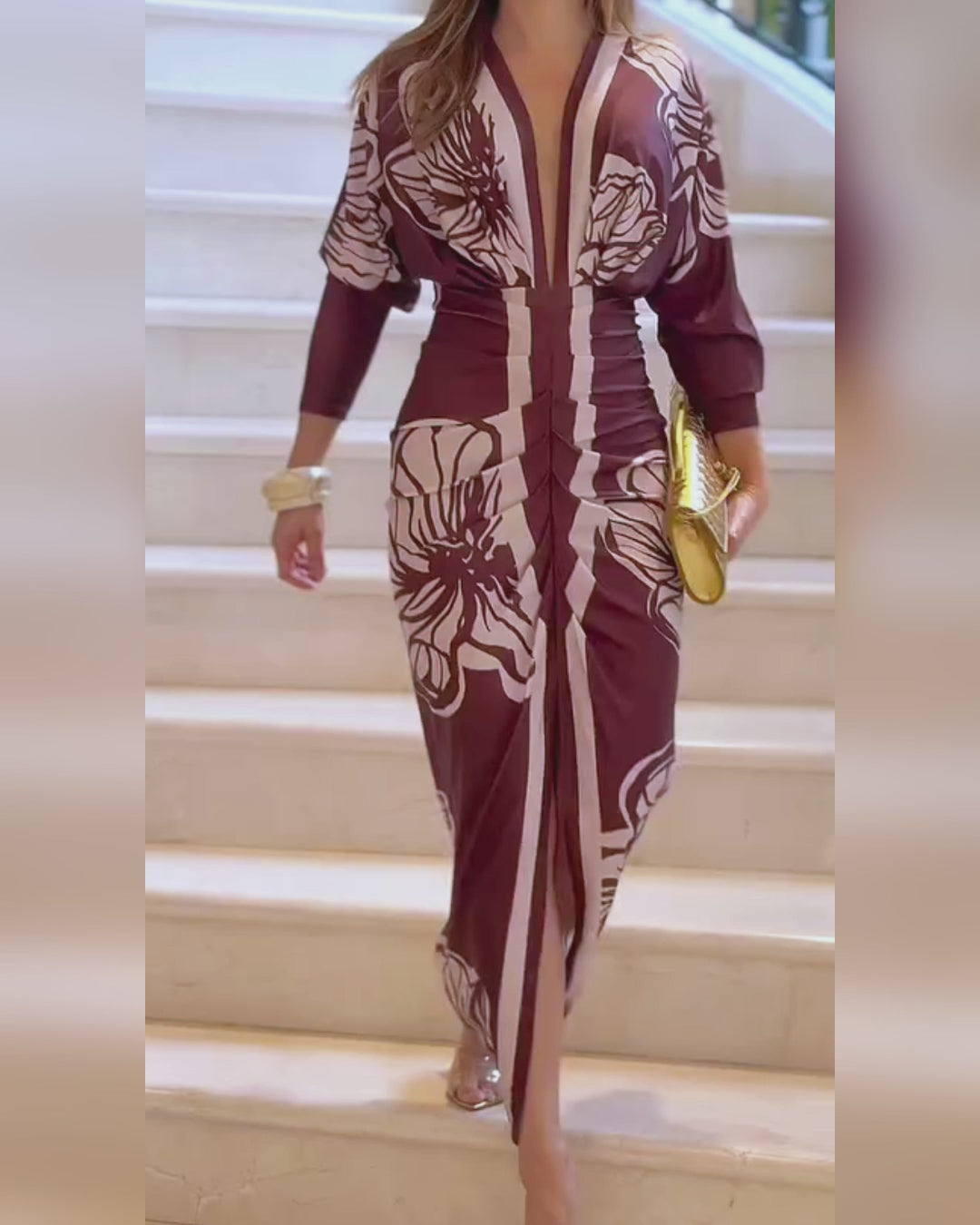 Floral Print Batwing Sleeve Plunge V Neckline Maxi Dress Elegant Ruched Slit Bodycon Dress