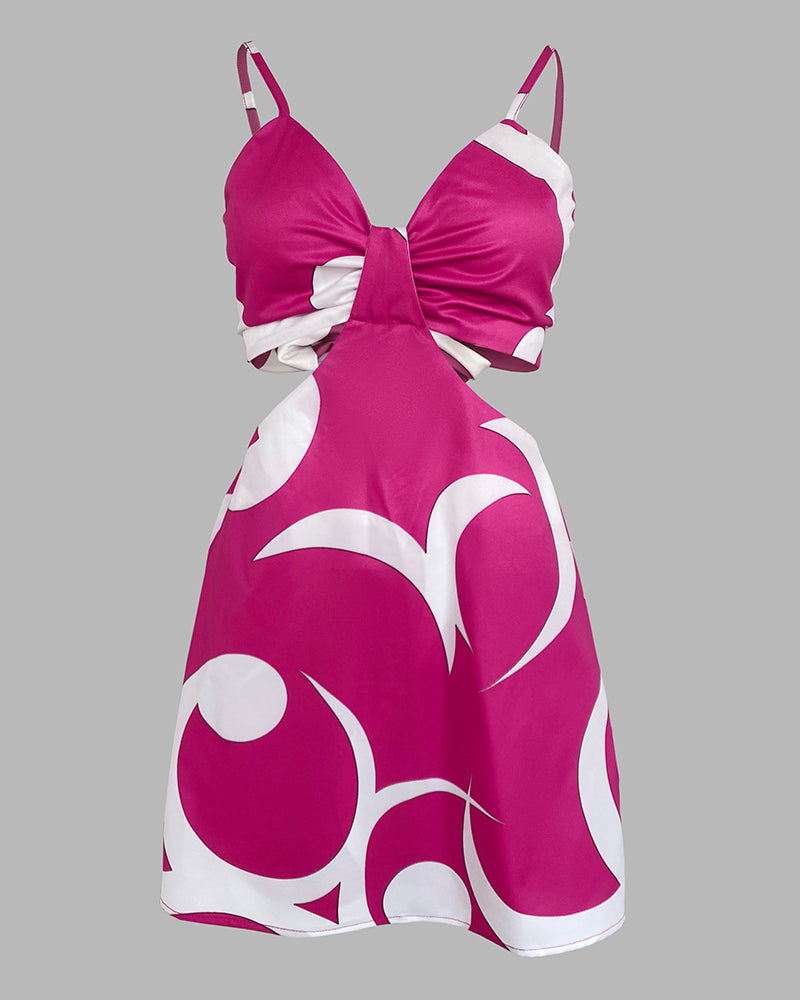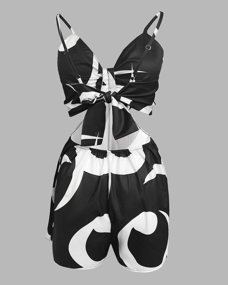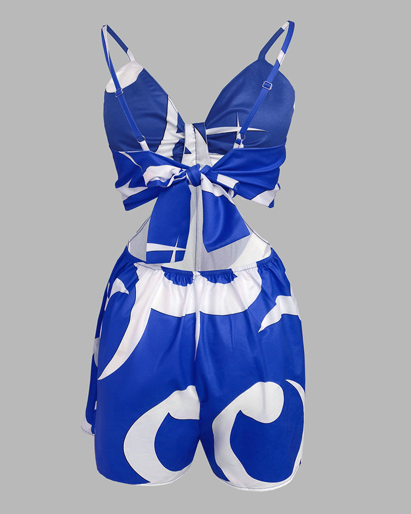 Floral Print Deep V-Neck Adjustable Spaghetti Straps Romper Casual Tied Back Cutout Slim Fit Skort Romper