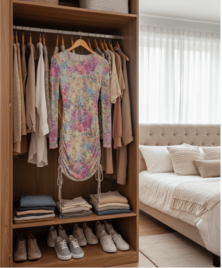 Design Details: Round neckline and long sleeves balance coverage with elegance. Floral print spreads evenly across the mesh for a fresh, romantic look. Side drawstring detail adds texture and versatility, while the back zipper ensures easy on and off.