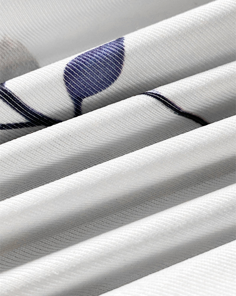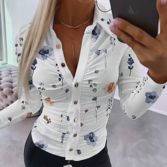 Floral Print Turn-down Collar Long Sleeve Metal Button Front Blouse Ruched Slim Fit Top