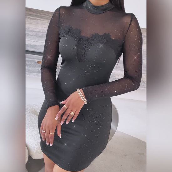Glitter Long Sleeve Mock Neck Sheer Mesh Patch Bodycon Dress Night Out Party Mini Dress