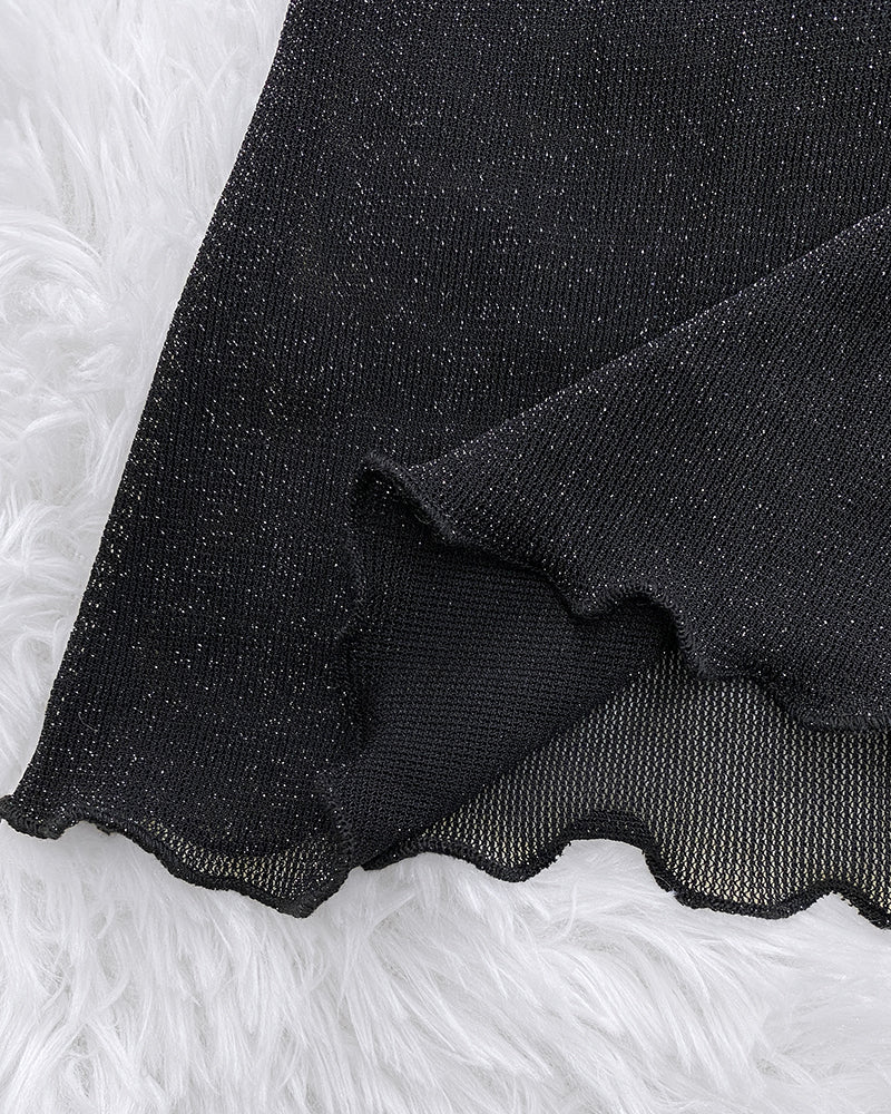 Glitter Lurex Mock Neck T Shirt Casual Sheer Mesh Slim Fit Blouse Top