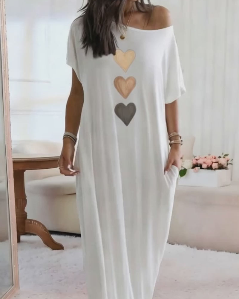 Heart Print Skew Neck Short Sleeve Maxi Dress Casual Pockets Design Loose Fit Loungewear Dress