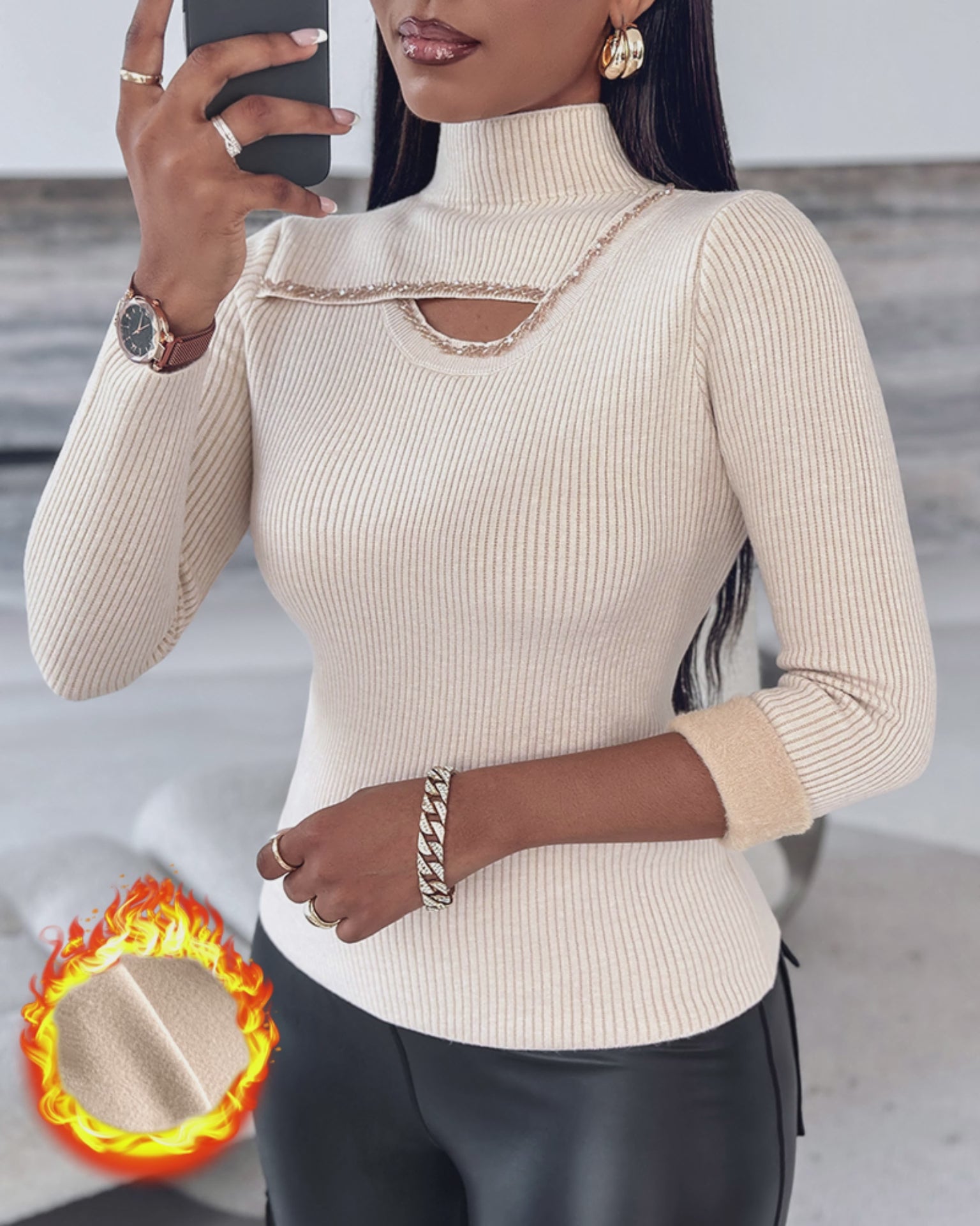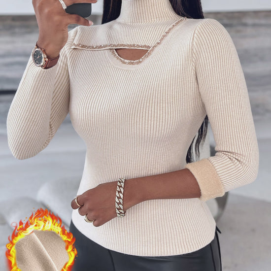 High Neck Long Sleeve Beaded Knit Sweater Hollow-out Fleece Lined Basic Layering Soft Versatile Thermal Top
