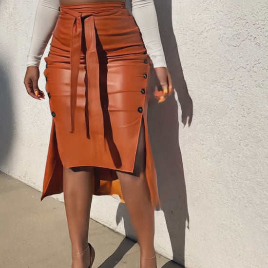 High Waisted Belted Pu Leather Pencil Skirt Side Button Split Work Midi Skirt