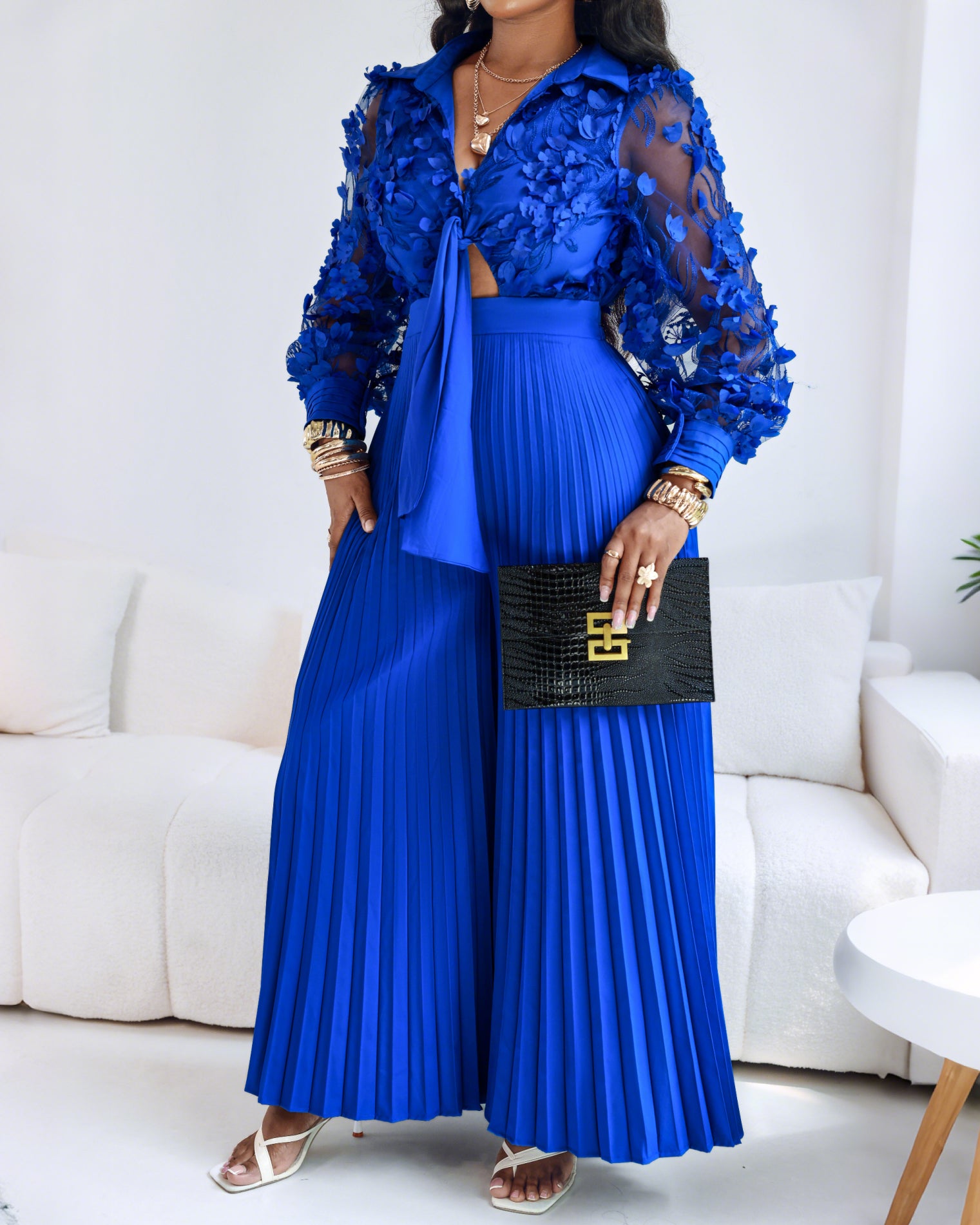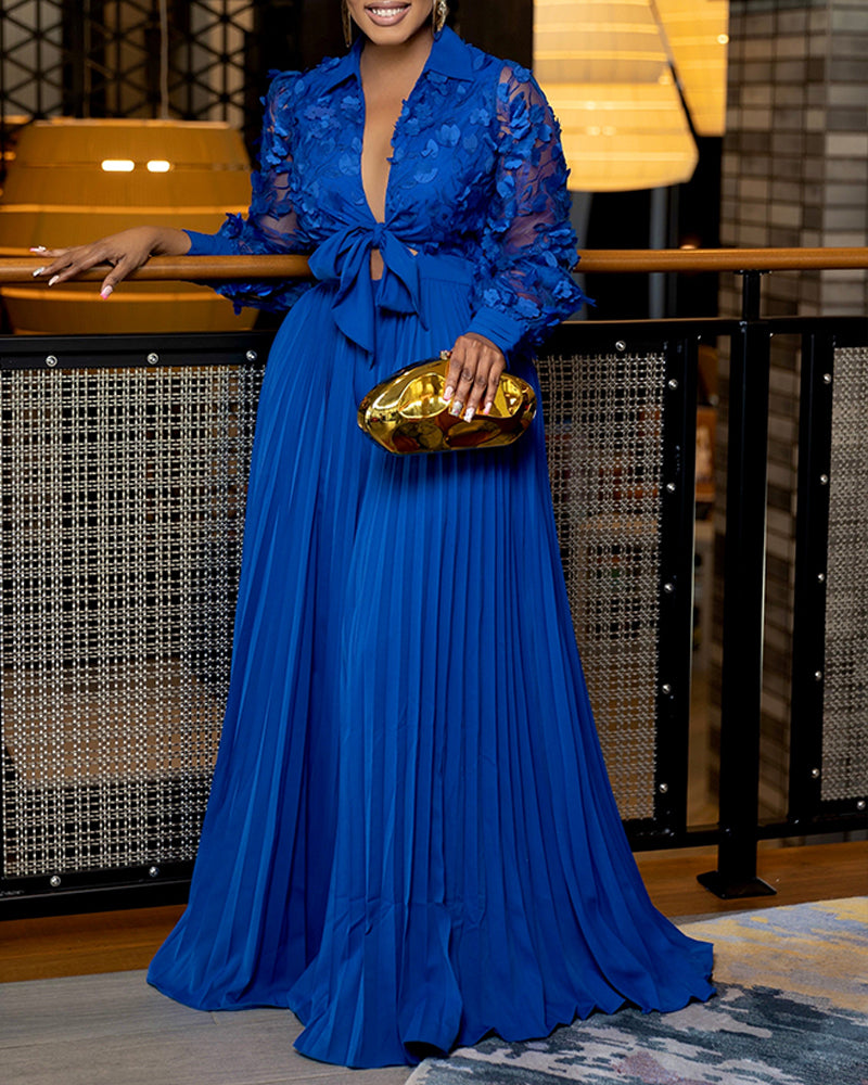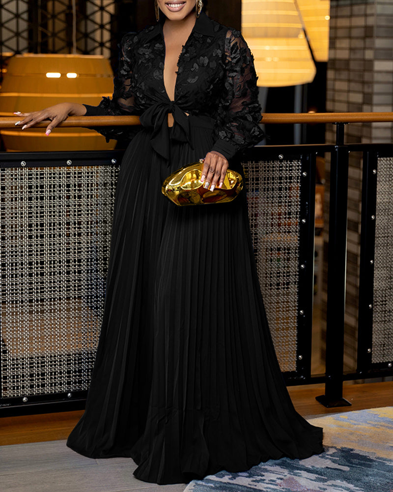 Jacquard Sheer Mesh Patch Turn-down Collar Jumpsuit Elegant Waist Tied Detail Pleated Flare Romper