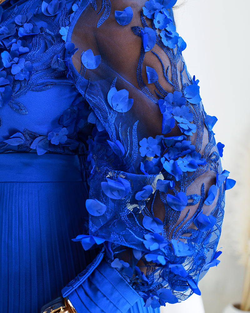 - Statement Sleeves – Sheer mesh sleeves with 3D floral appliqués add soft romance and texture, elevating this jumpsuit beyond basics.