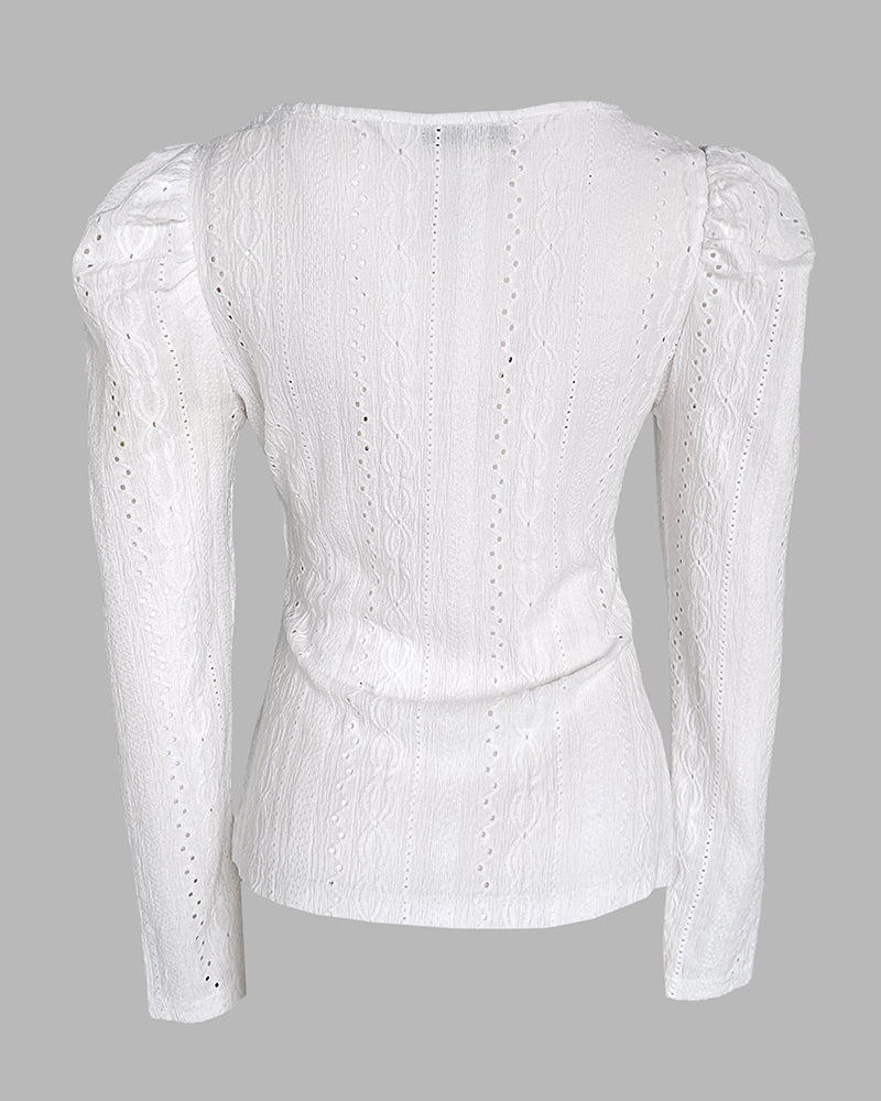 Jacquard Square Neck Puff Sleeve Eyelet Embroidery T-Shirt Long Sleeve Slim Fit Top
