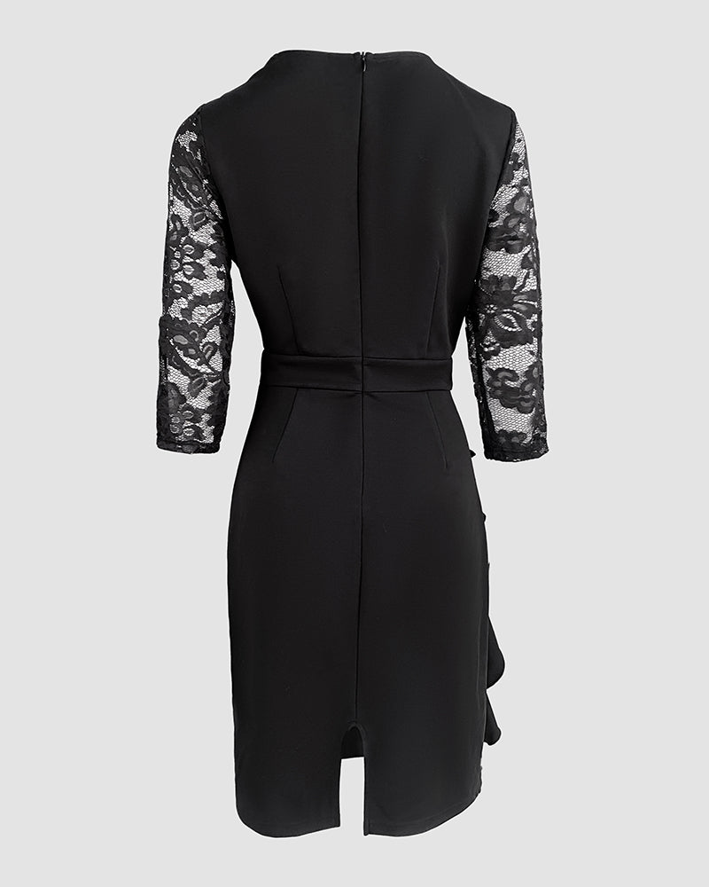 Metal Decor V-Neck Lace Spliced Three Quarters Sleeves Ruffles Design Evening Dress Zipper Back Slit Slim Fit Party Dress with Belt