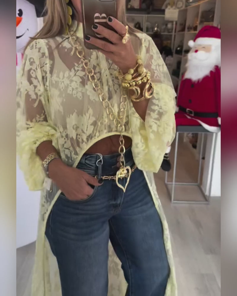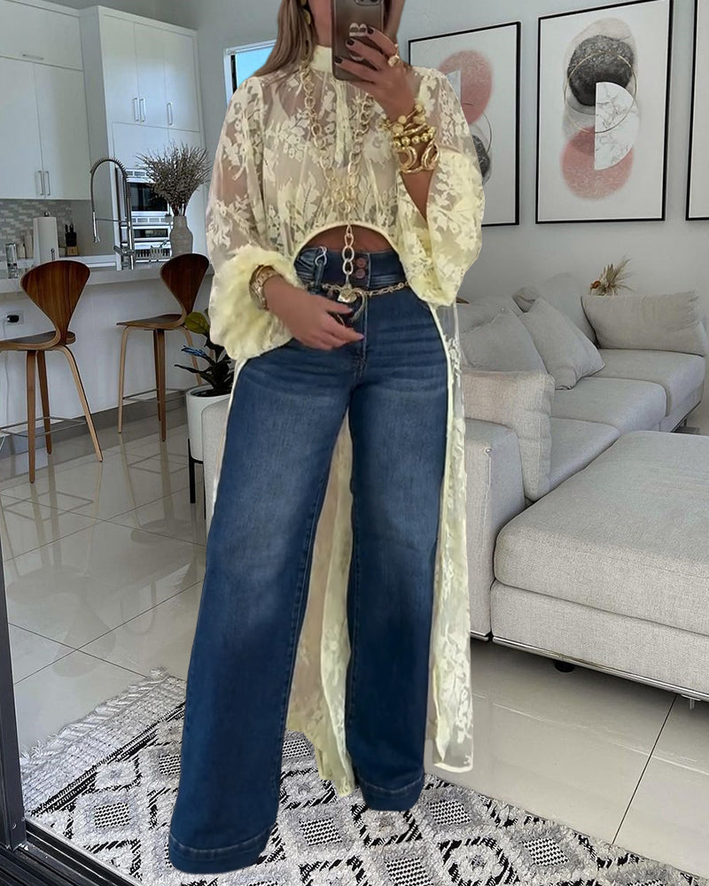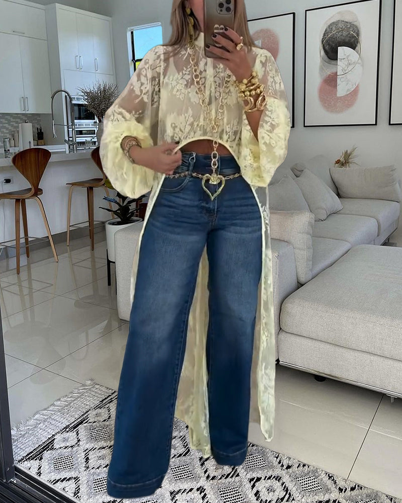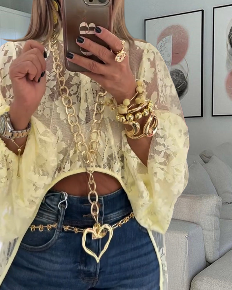 Mock Neck Lantern Sleeve High-Low Hem Floral Lace Sheer Top