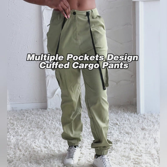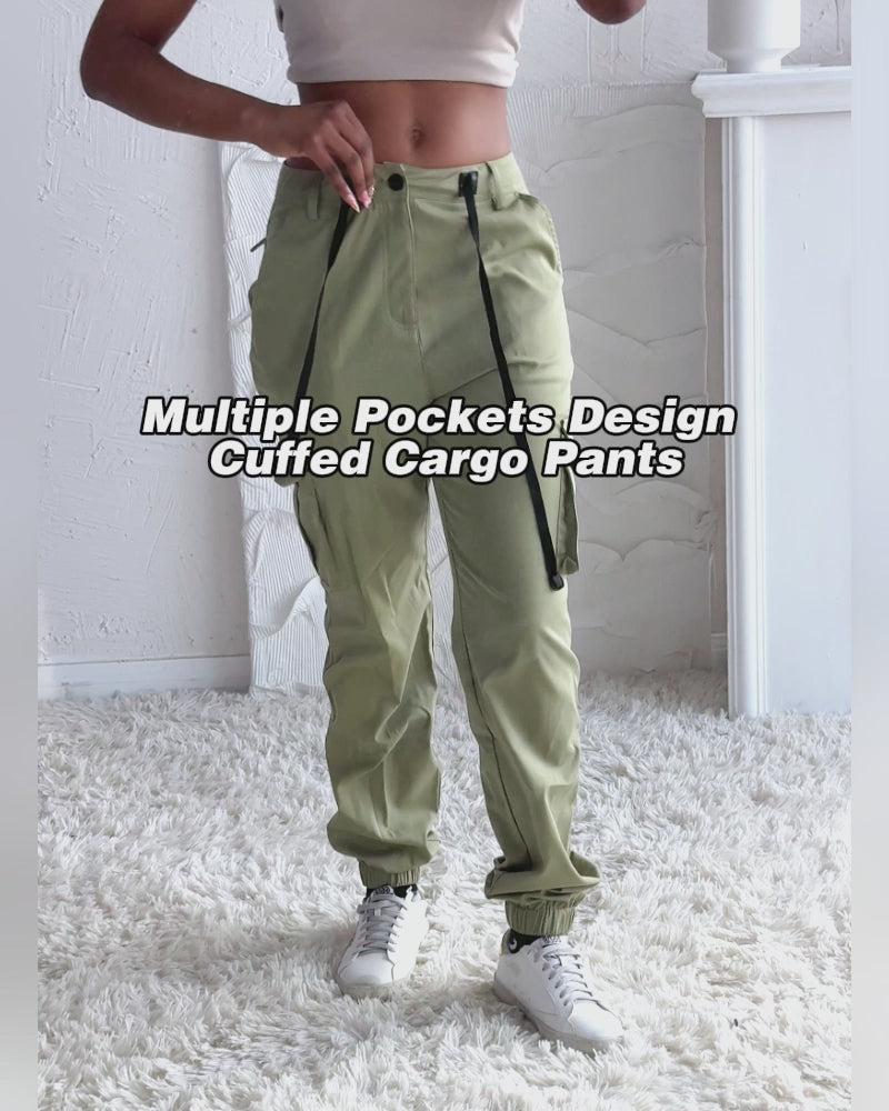 Zipper Fly Drawstring Elastic Back Waist Cuffed Trousers Casual Multiple Flap Pockets Design Cargo Pants