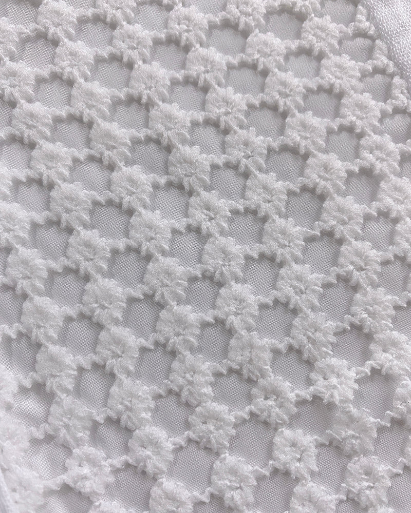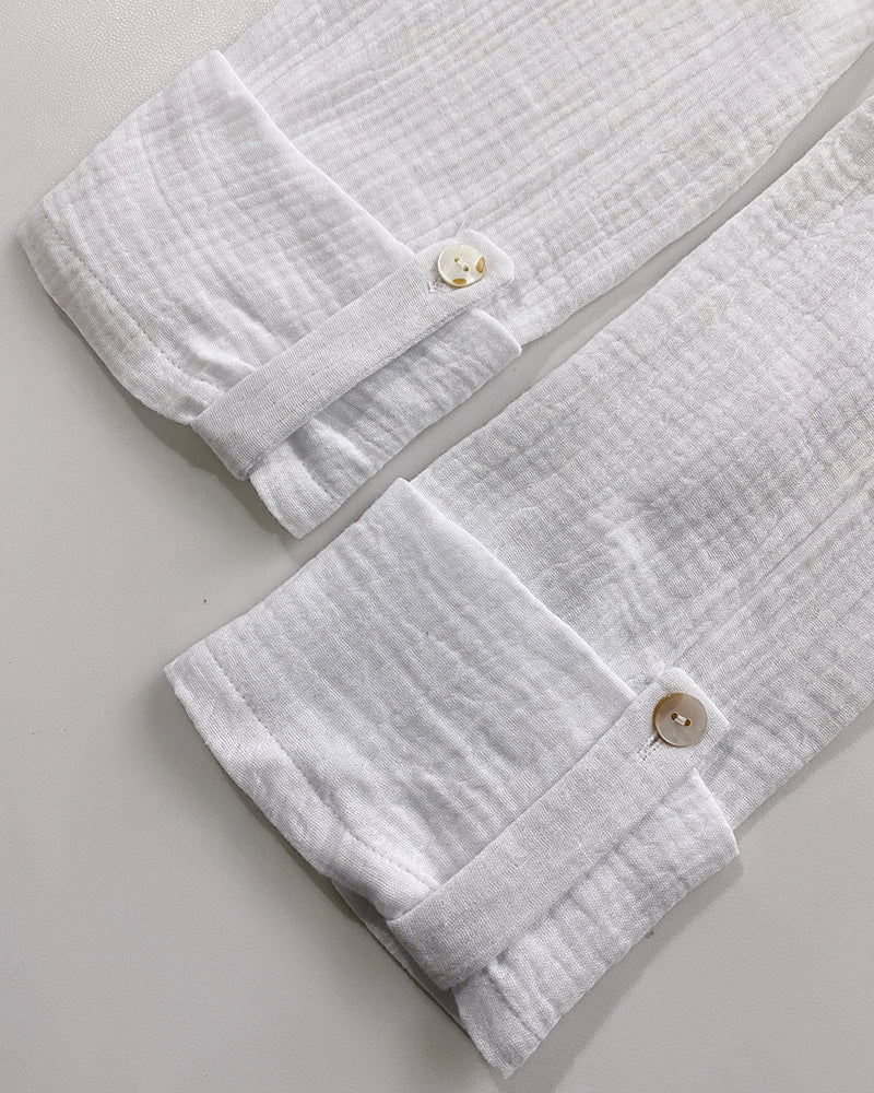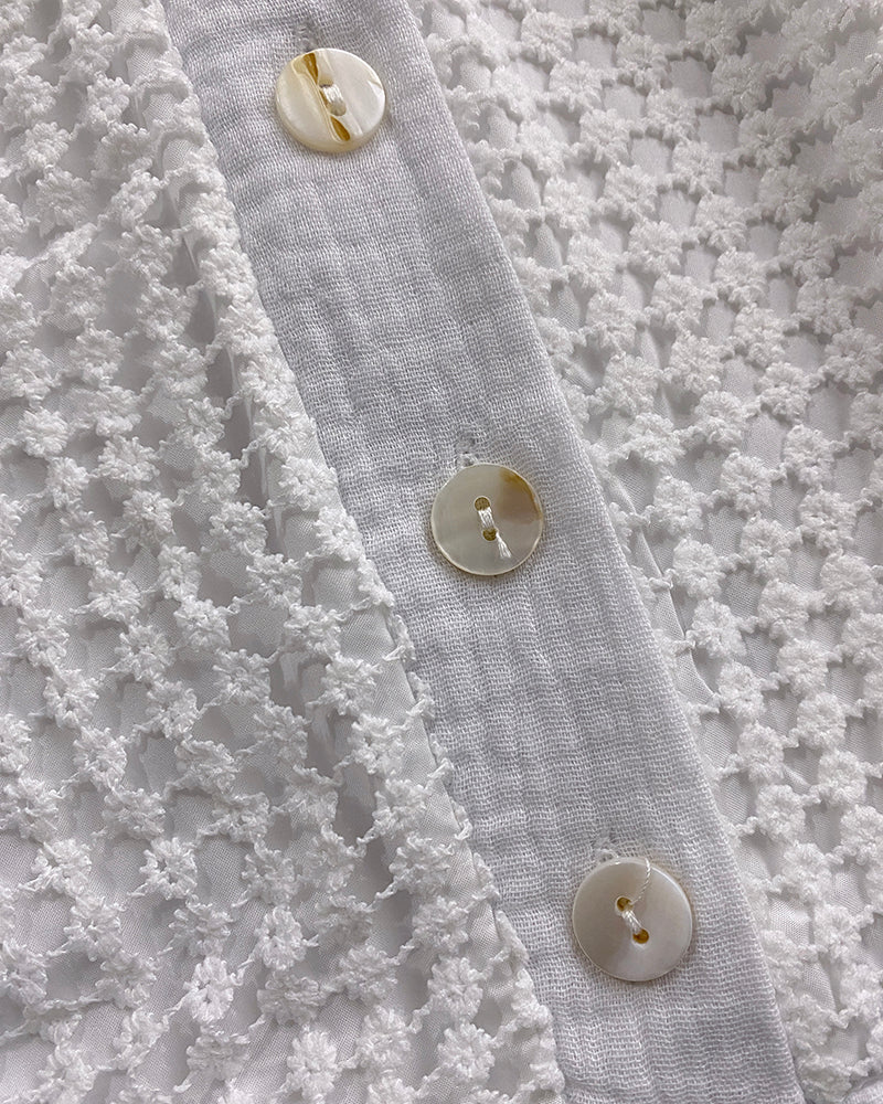 - Design Details: Notch V-neck frames the collarbone; lace overlay and half-button front add feminine detail; ruffle hem and rolled-up sleeves enhance playful elegance.