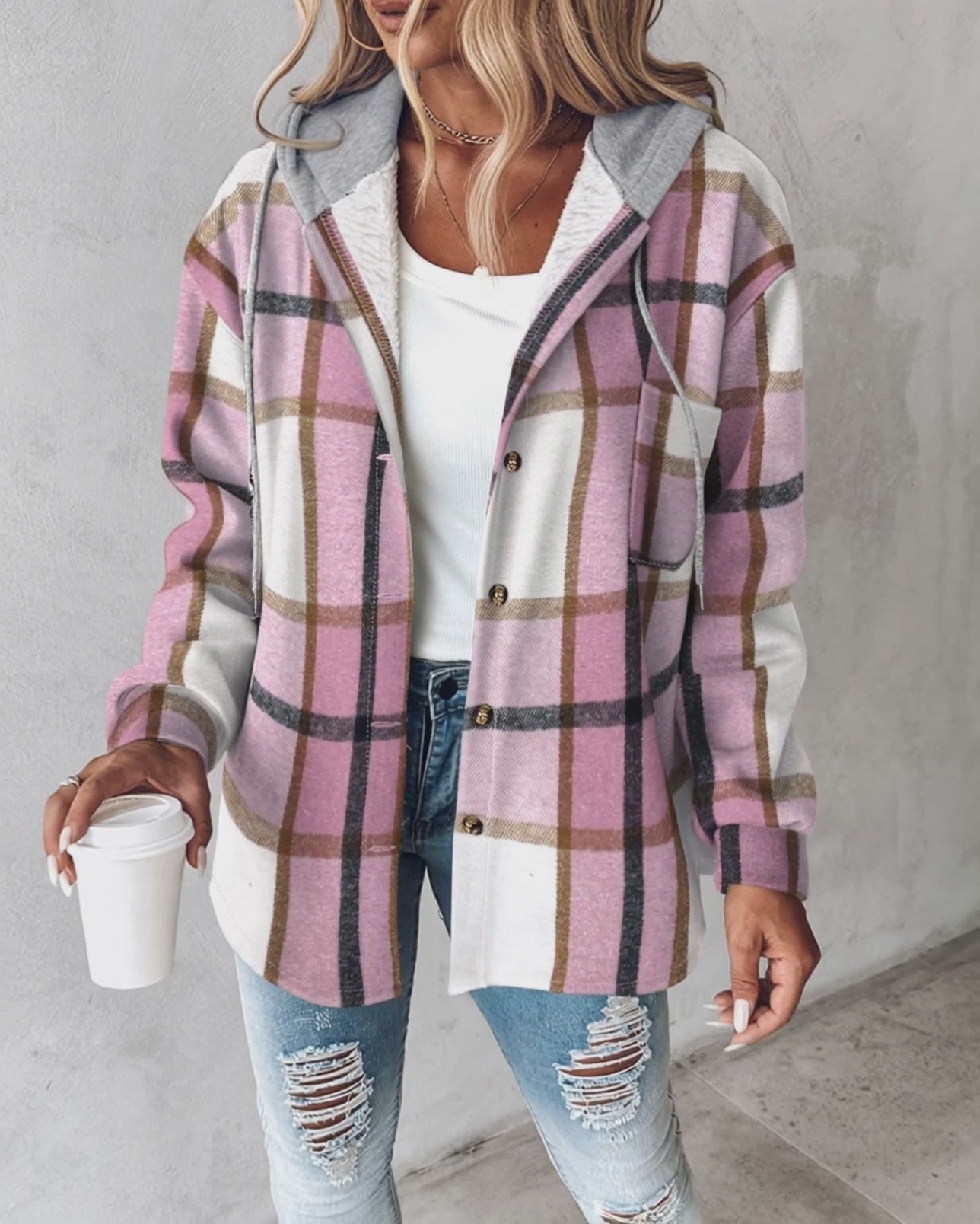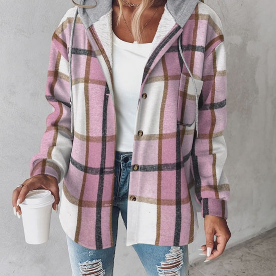 Plaid Print Long Sleeve Button Front Drawstring Hoodie Coat Casual Pocket Design Thermal Lined Shirt Coat