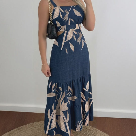 Plants Placement Print Adjustable Straps Cutout Waist Shirred Back Maxi Dress Casual Cinched Waist Ruffle Hem Vacation Dress