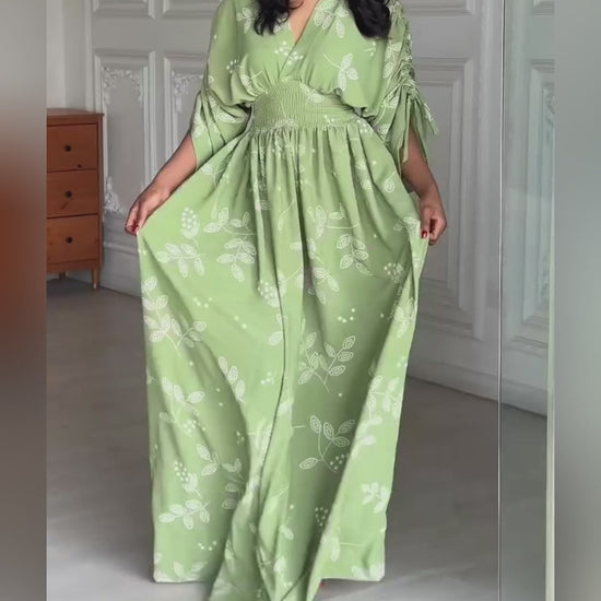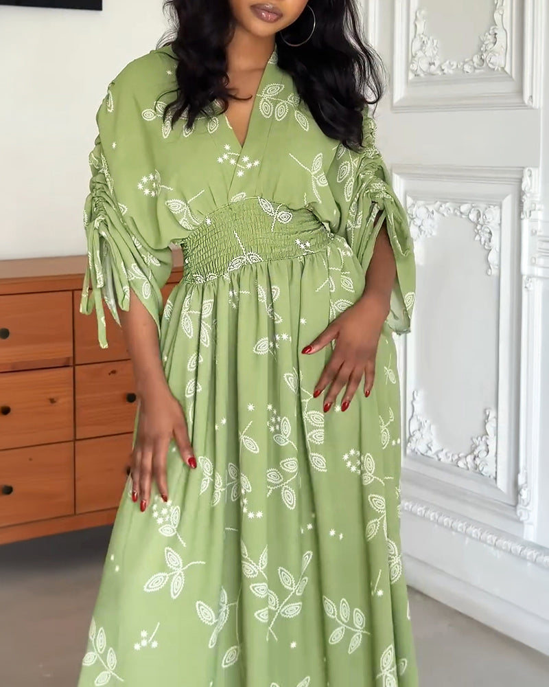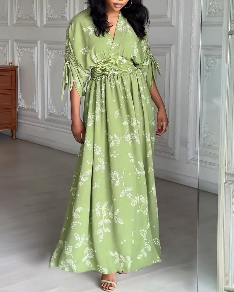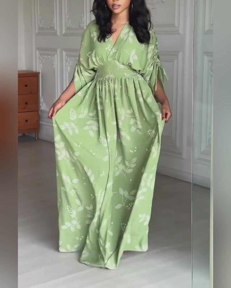 Plants Print Overlap V-Neck Drawstring Sleeve Shirred Waist Maxi Dress Casual Cinched Waist Zipper Back Vacation Dress