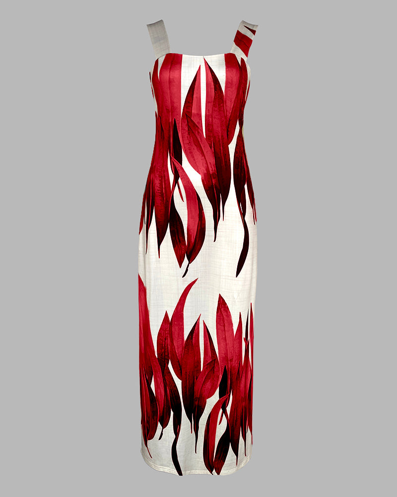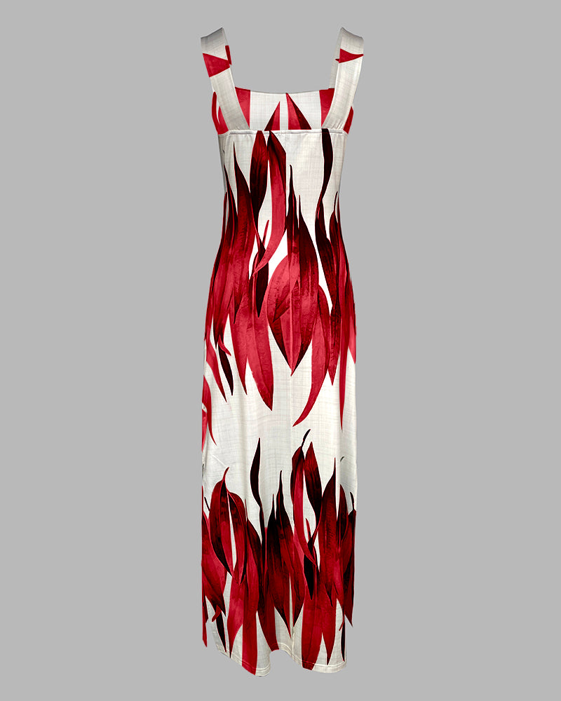 Plants Print Square Neck Thick Strap Maxi Dress Casual Slim Fit Side Slit Vacation Dress with Pockets