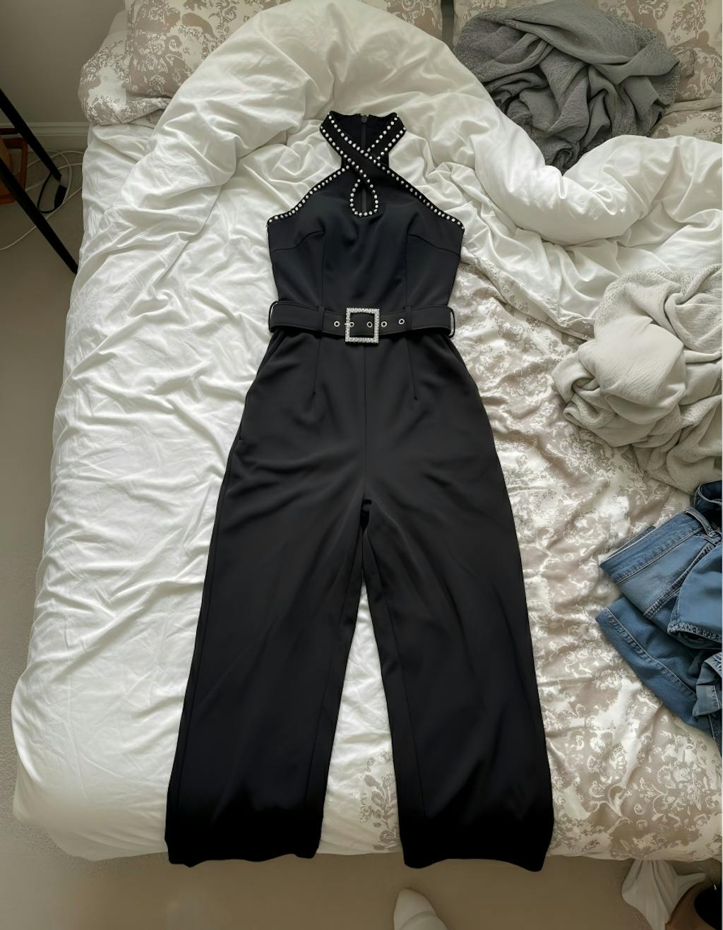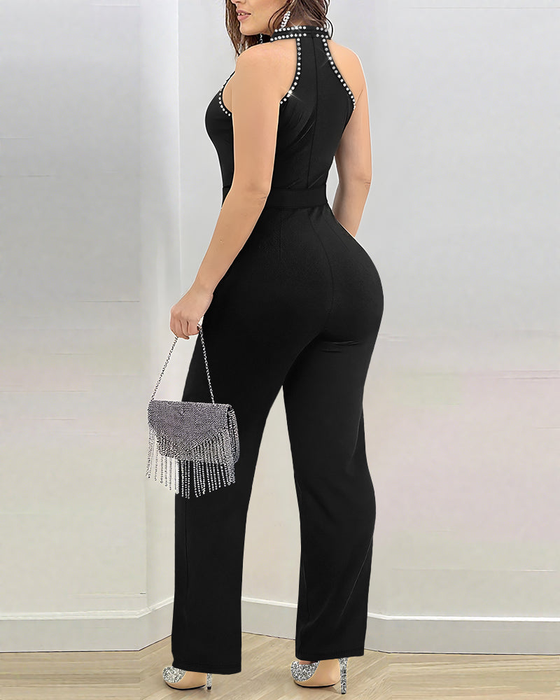 Rhinestone Decor Criss Cross Halter Sleeveless Hollow Water Drop Front Overalls Elegant High Waist Zipper Back Jumpsuit with Rhinestone Decor Belt