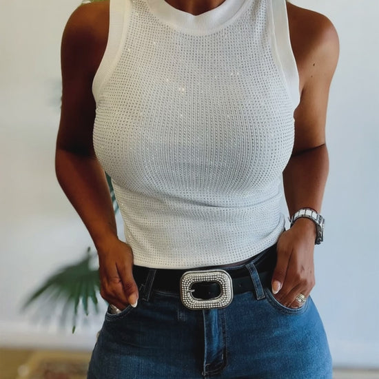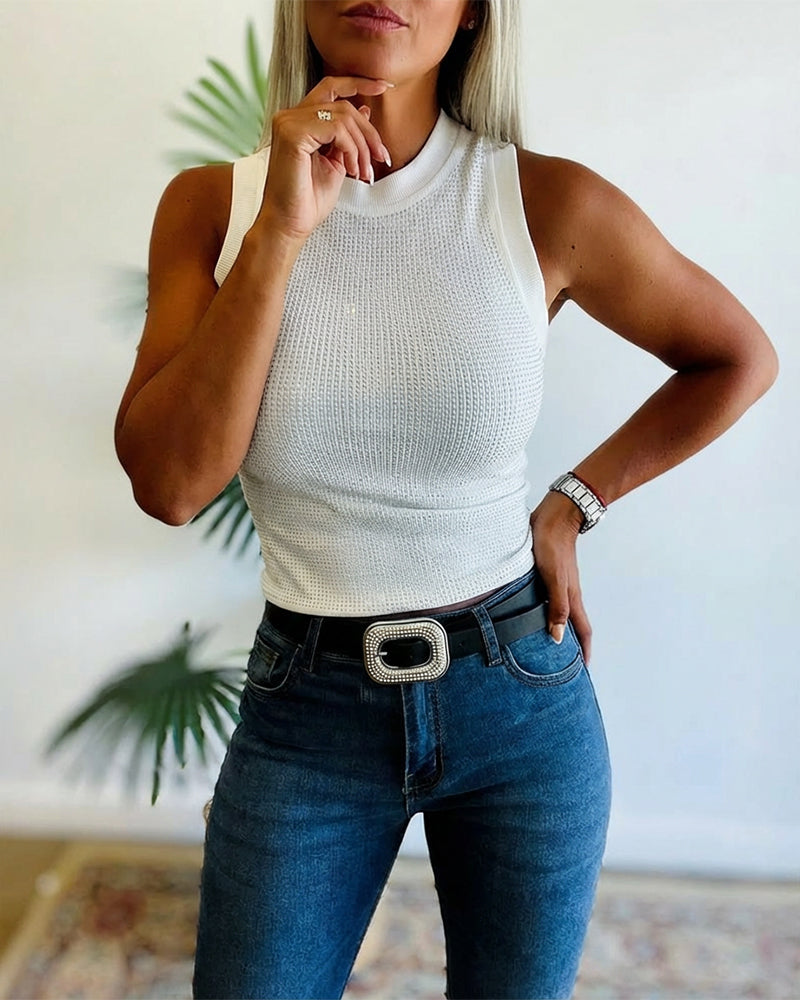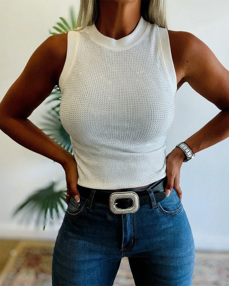 Rhinestone Decor O-neck Sleeveless Knit Tee Slim Fit Tank Top