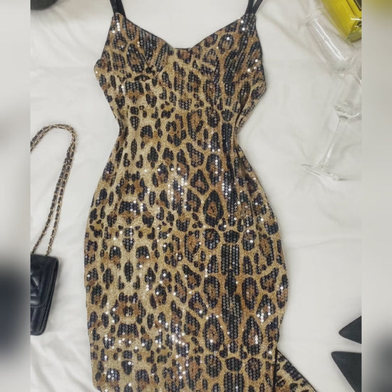 Sequin Leopard Pattern V-Neck Spaghetti Strap Bodycon Dress Slit Party Club Sexy Dress