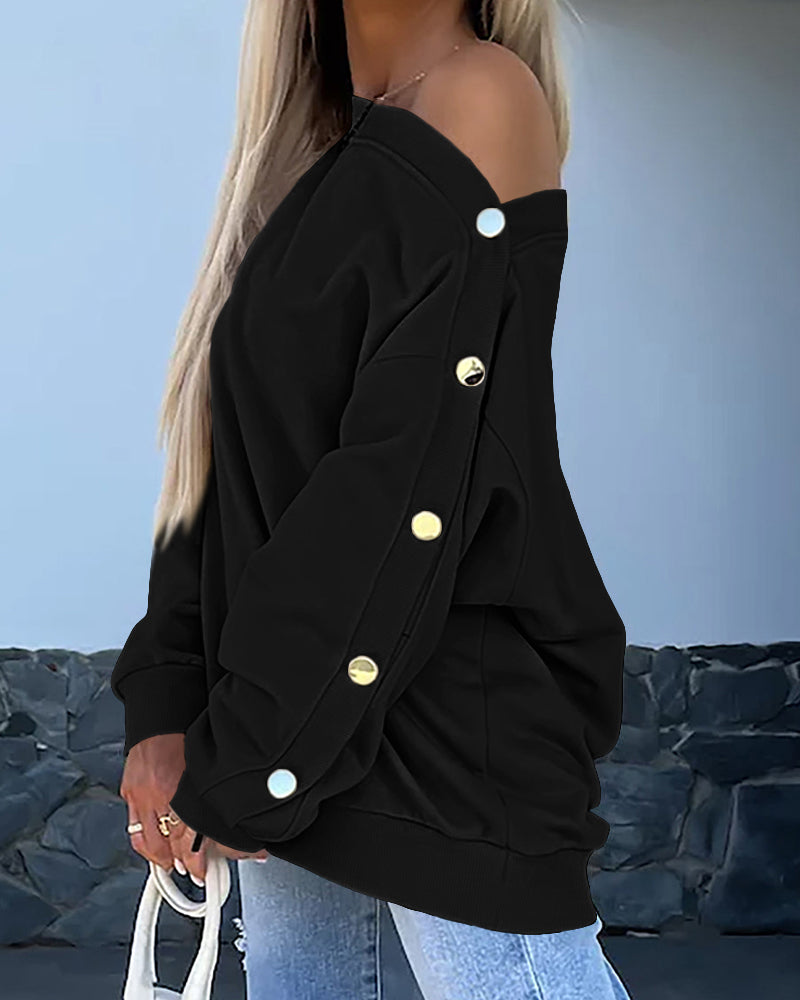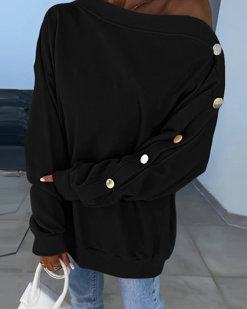 Skew Neck Buttoned Sweatshirt Casual Long Sleeve Pullover Tops Outfits