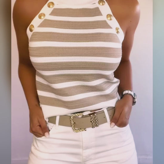 Striped Halter Sleeveless Tank Causal Golden Button Decor Breathable Knit Top
