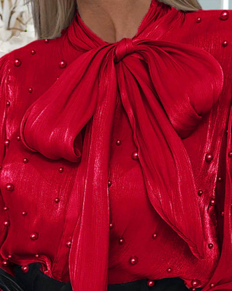 Tie Neck Beaded Long Sleeve Tied Detail Blouses Casual Shirts