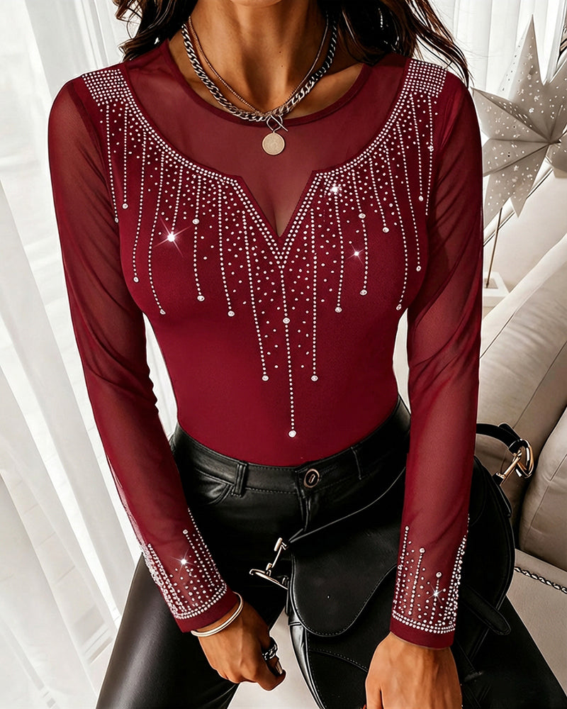 Pearls Decor Mock Neck Sheer Mesh Spliced Ruched Tee Hollow-out Back Slim Fit Textured Top
