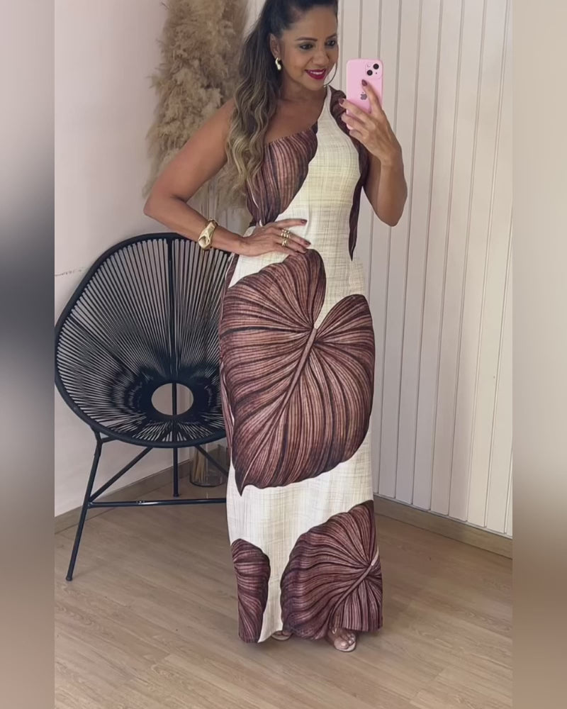 Tropical Print One Shoulder Bodycon Slit Dress Sexy Slim Fit Maxi Dress